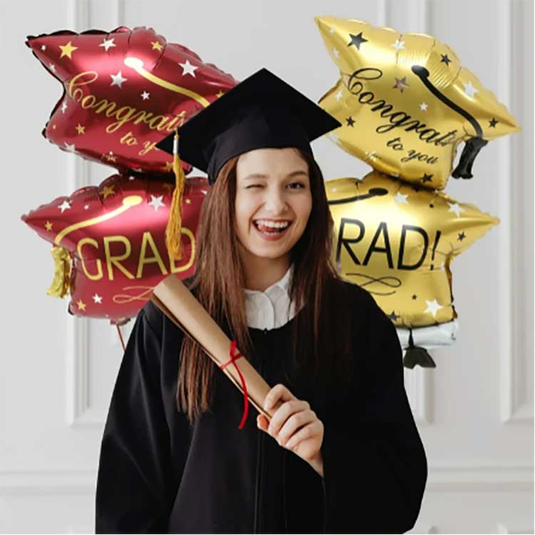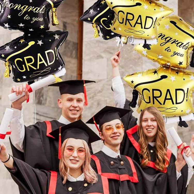 ကျွန်ုပ်တို့၏ 32 လက်မ Graduation Cap Balloons အစုံကို 18-micron-အထူ အရည်အသွေးမြင့် အလူမီနီယမ် PET ဖလင်ဖြင့် ပြုလုပ်ထားသည်။ ဤရုပ်ရှင်သည် အလွန်ကောင်းမွန်သော ပျော့ပျောင်းမှုရှိပြီး အပြည့်အ၀ ဖောင်းကားကာ ဖိသိပ်မှုနှင့် သက်ရောက်မှုများကို ခံနိုင်ရည်ရှိပါသည်—ကျောင်းများနှင့် အလားတူနေရာများအတွက် ပြီးပြည့်စုံပါသည်။ ကျွန်ုပ်တို့သည် ပုံနှိပ်ခြင်းအတွက် ပတ်ဝန်းကျင်နှင့် သဟဇာတဖြစ်သော မှင်များကို အသုံးပြုကာ အရောင်ဖျော့ခြင်းမှ ခံနိုင်ရည်ရှိသော တောက်ပသော အရောင်များပင် ရရှိစေပါသည်။ အပြင်မှာ ဘွဲ့နှင်းသဘင် အခမ်းအနားတွေလိုမျိုး နေရောင်နဲ့ နာရီပေါင်းများစွာ ထိတွေ့ပြီးနောက်မှာတောင် ပုံစံတွေနဲ့ အရောင်တွေက အရင်ကထက် တောက်ပြောင်နေဆဲပါ။