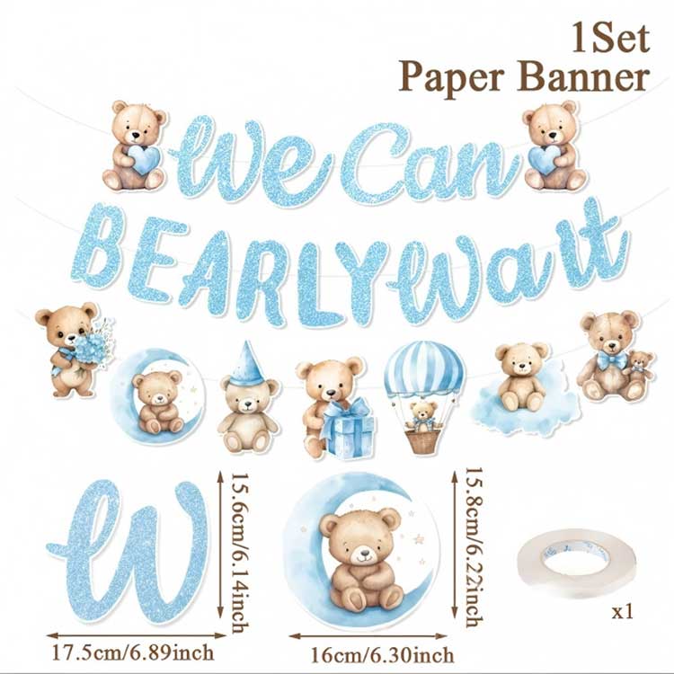 မွေးနေ့နဖူးစည်းစာတမ်း- အလှဆင်ရန် ချိတ်ဆွဲရန် ကြိုး ၂-၃ ကြိုးပါသော နဖူးစည်း ၁ ခု/အစုံ။ "Happy Birthday" သို့မဟုတ် "Welcome" ဖြင့် ရိုက်နှိပ်ထားသည်။ ကလေးပုံစံ စာသား