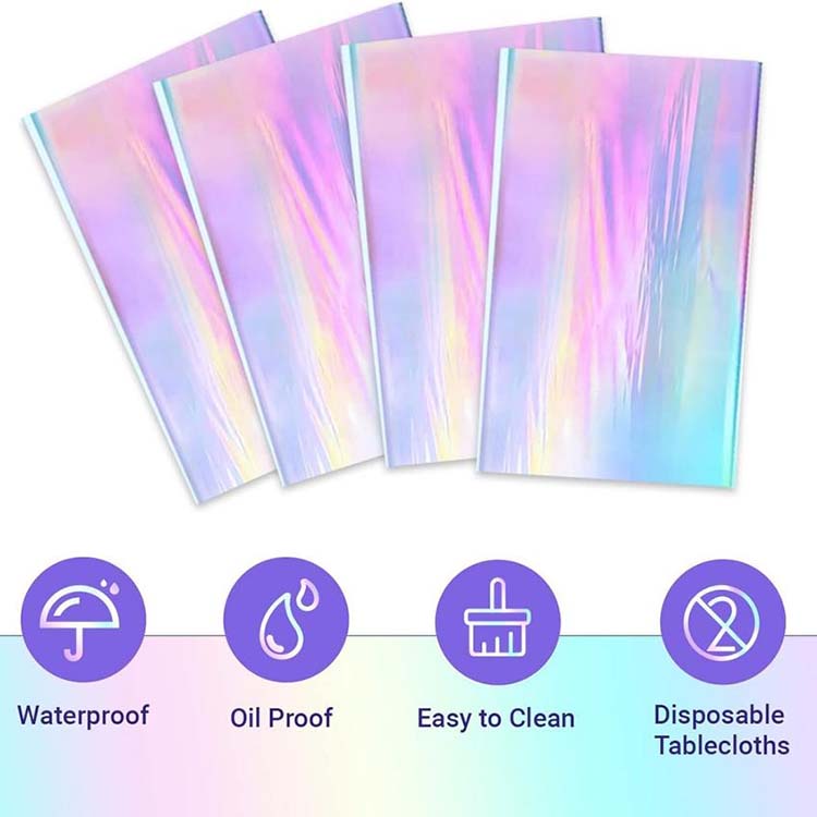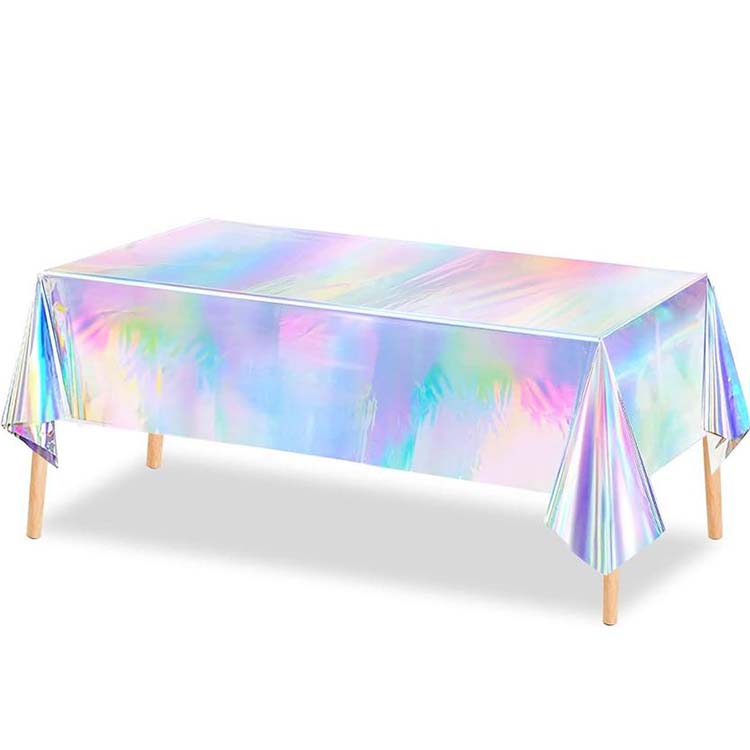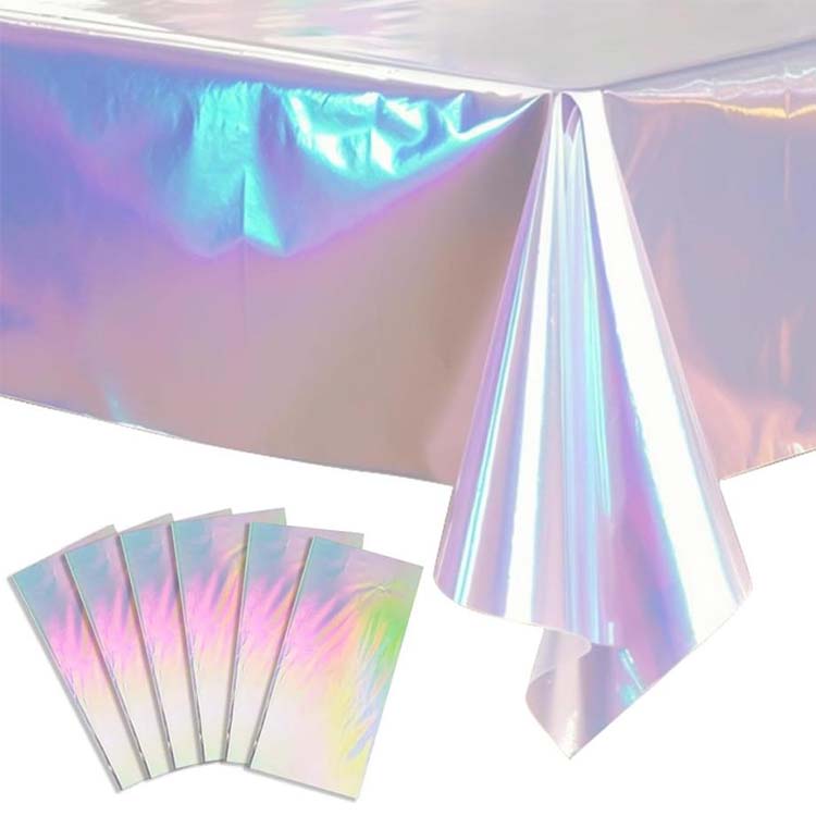 လေဆာလေဆာာေးတစ်ခါသုံး tabecloth: layer optical film composite နည်းပညာမှတစ်ဆင့် 360 ဒီဂရီ hyographic ရောင်ပြန်သောအကျိုးသက်ရောက်မှုကိုမှတစ်ဆင့်အောင်မြင်သည်။ အရောင်းရဆုံး "Rainbow Laser Tablecloth" သည် 54x108 လက်မ၏စံအရွယ်အစား 54x108 လက်မကိုမွေးစားသည်။ ၎င်းသည်ပါတီမြင်ကွင်းများတွင်အလင်းနှင့်အရိပ်စီးဆင်းမှုကိုဖြစ်ပေါ်စေသည်။