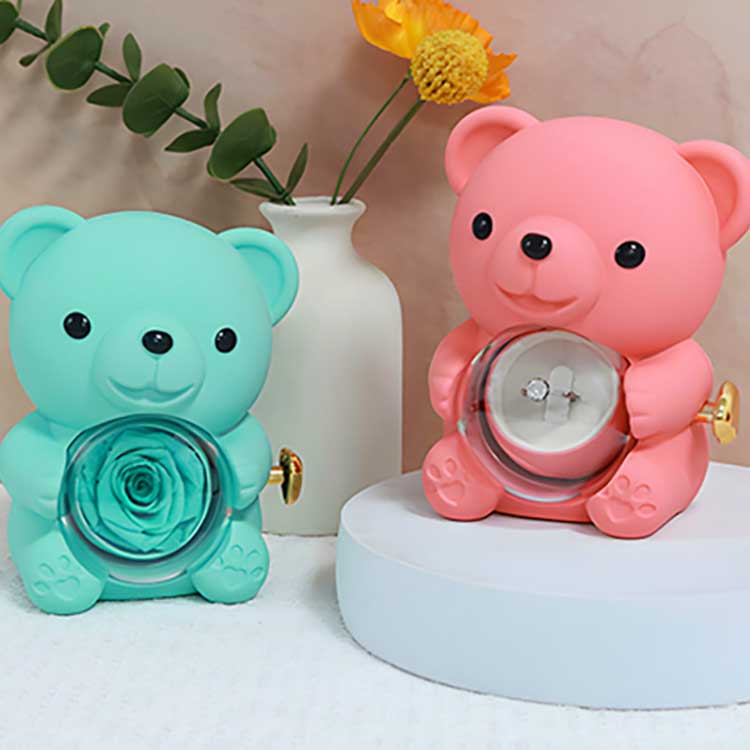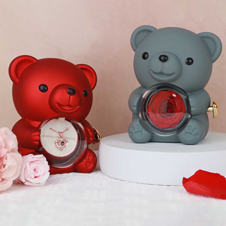 ဤ Hug Bear Rose လက်ဝတ်ရတနာသေတ္တာကို စားပွဲ၊ စာအုပ်စင် သို့မဟုတ် ကုတင်ဘေး စားပွဲပေါ်တွင် ပြသရန် အသုံးပြုသည်။ ၎င်း၏မျက်လုံးကိုဖမ်းစားနိုင်ဆုံးအင်္ဂါရပ်မှာအလယ်ဗဟိုတွင်ထိန်းသိမ်းထားသောနှင်းဆီဖြစ်သည်။ နှင်းဆီပွင့်ကိုဖွင့်လိုက်တာနဲ့ လက်ဝတ်ရတနာတွေ၊ လက်စွပ်တွေ၊ ဒါမှမဟုတ် အမှတ်တရလက်ဆောင်တွေ သိမ်းဆည်းဖို့ ကွက်လပ်တစ်ခုကို ဖော်ထုတ်လိုက်ပါတယ်။
